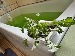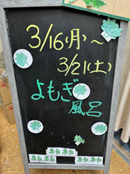 季節の湯:よもぎ 2026.03.16 デイサービス 今月の季節の湯は「よもぎ」です。 爽やかな入浴剤+畑に自生しているよもぎが良いアクセントです。 よもぎちゃんも入浴のお誘いをしてくれています。 今週いっぱい、よもぎ風呂でございます。 一覧に戻る